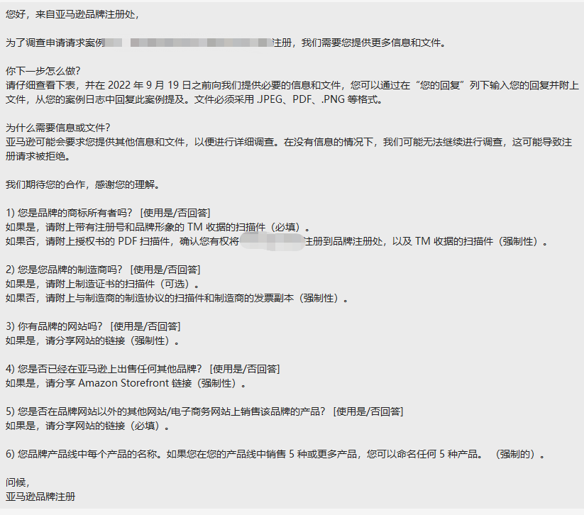 之前有很多卖家反映,美国商标在进行备案的时候遇到了以下6个问题,相应的解决思路,小熙也分享在了上一篇推文中《您是该品牌TM的所有者吗?美国商标备案遇到的6个问题该如何回复?》 但也有不少卖家咨询小熙,不知道在备案时验证码该如何去回复? 一、回复方式 以下三种回复方式,供卖家朋友参考: 第一种:最直接的方式,点击官方邮件里的链接直接回复,链接上有Case ID的号码; 第二种:可以在后台“品牌旗舰店-管理店铺”找到入口进行回复; 第三种:当您找不到邮件或邮件的链接无效时,可以通过后台“问题日志”进行回复; 二、操作步骤 下面我们来操作第三种方式: 第一步:在搜索框中输入“品牌注册”,在搜索结果中选择“亚马逊品牌注册”; 第二步:点击“管理品牌注册申请常见问题”; 第三步:在下方找到“问题日志”,点击进入您的申请记录页面; 第四步:找到对应问题编号,也就是邮件中的“Case ID”,点击黄色的“回复”按键,进入邮件页面。 注意:在向亚马逊回复验证码时,需要在邮件中附上“Case ID”,申请才会被受理。 关于品牌备案遇到视频验证的解决思路,小熙之前也有分享过《您是该品牌TM的所有者吗?美国商标备案遇到的6个问题该如何回复?》 三、写在最后 当卖家在遇到品牌备案时,建议如实回复,然后去提供亚马逊需要的资料。以上操作方法供卖家朋友们参考,如果您也遇到相关备案问题,不懂如何操作,也可咨询小熙:ZXKJ2019001 术业有专攻,专业事给专业人做,卓熙自17年成立以来,专业从事商标注册、专利申请、税务合规、海外公司注册开户等服务,已为上万家跨境企业的知识产权保驾护航,有相关问题或需求的朋友,欢迎咨询小熙哦~~ END 扫码请备注咨询产品或问题 跨境资讯、福利活动抢先知