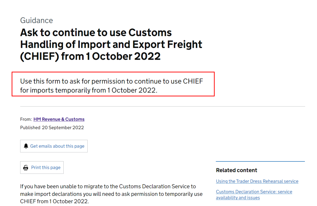 政策详情:https://www.gov.uk/guidance/ask-to-continue-to-use-customs-handling-of-import-and-export-freight-chief-from-1-october-2022
