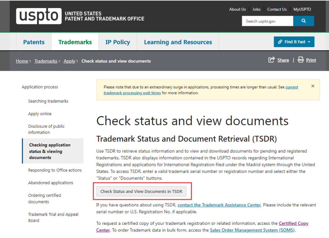 申请人可自行在商标局TSDR系统(https://tsdr.uspto.gov/)下载电子证书,具体操作流程可参照下图。