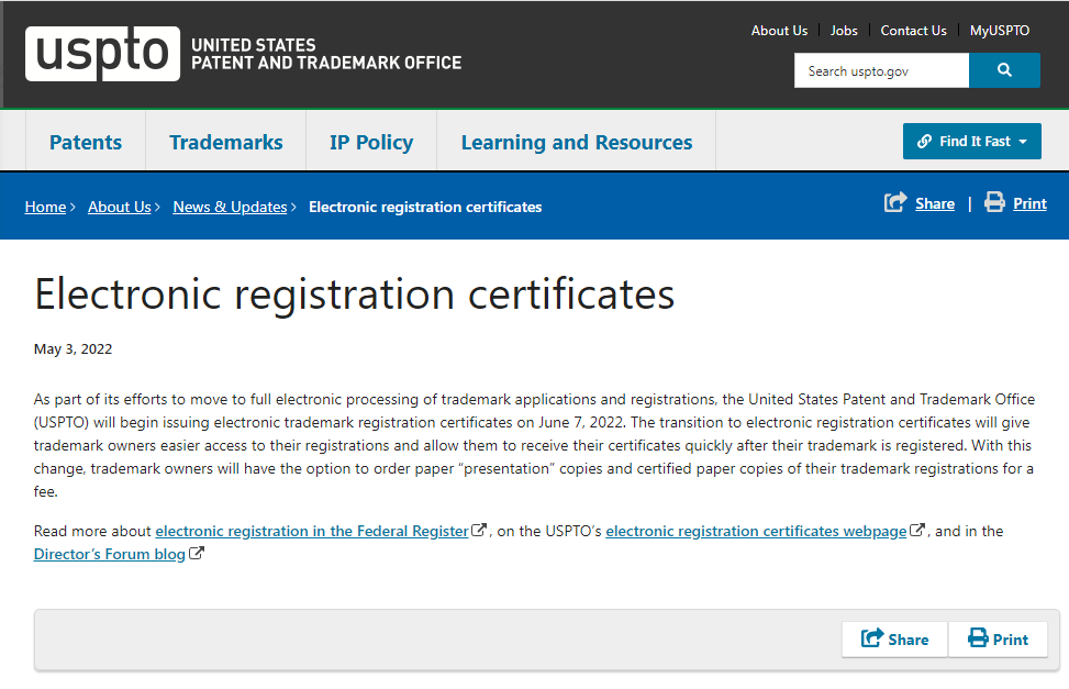 5月3日,USPTO官方发布通知:自2022年6月7日开始发放电子商标注册证书。