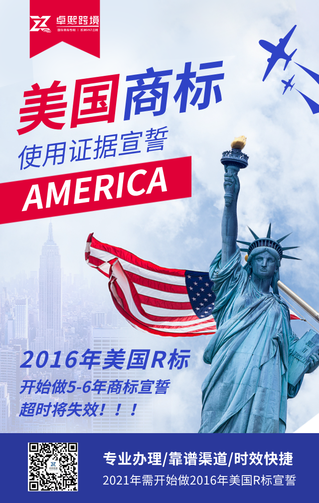 2016年注册成功的美国R标,今年要开始做第5-6年的宣誓了,如果您不清楚自己的美标宣誓时间可以联系我们,错过宣誓时间,商标会失效!一定要重视!避免失去商标后续的使用权等。