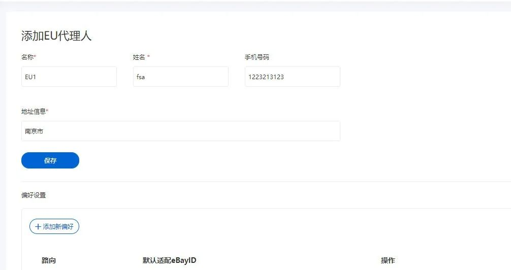 点击“添加EU代理人”按钮,进入到添加EU代理人页面,填写信息点击保存即可。