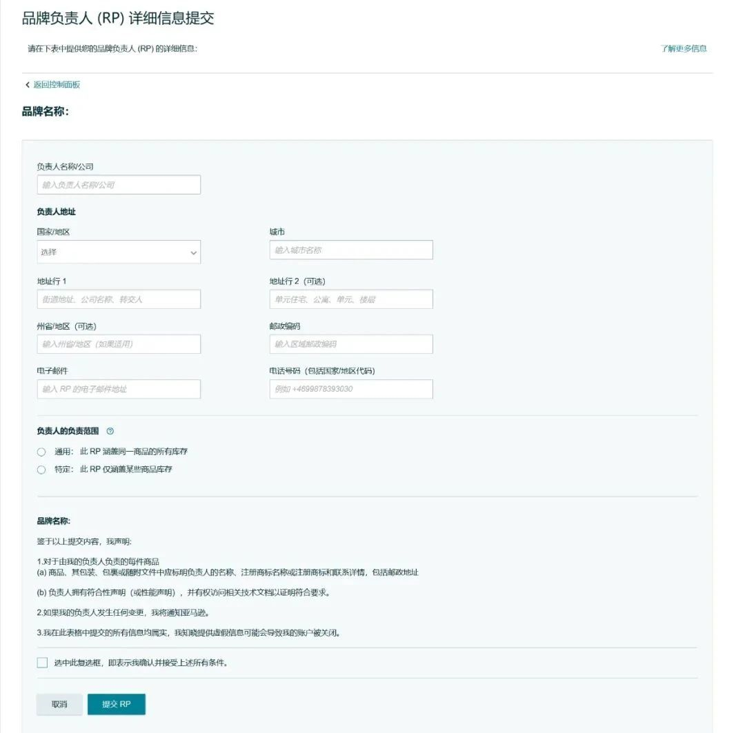 1、将欧盟负责人信息上传至控制面板,在控制面板中,提供您的欧盟负责人实体名称及详细联系信息。