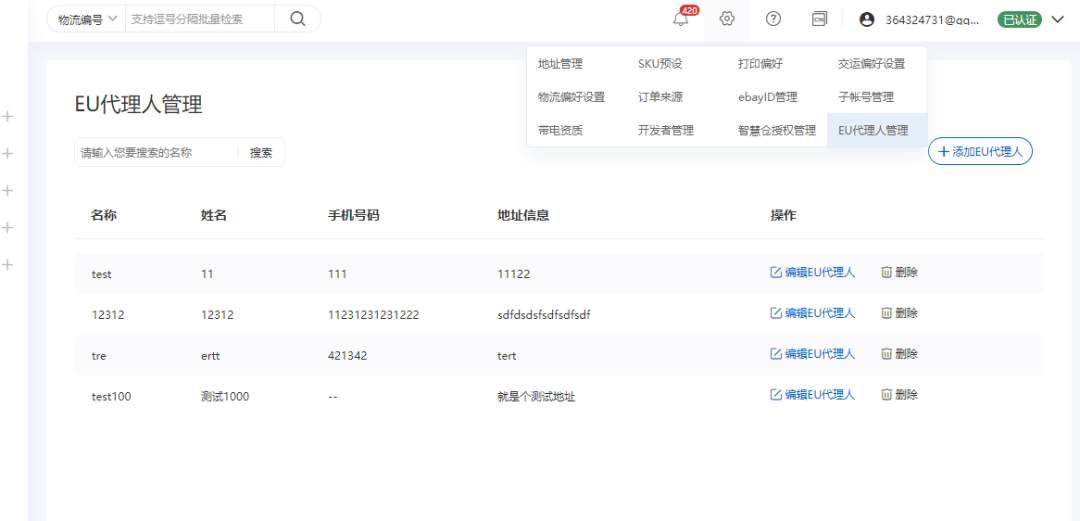 点击删除可以删除当前EU代理人,搜索框输入对于名称,点击搜索可以找到对应EU代理人。